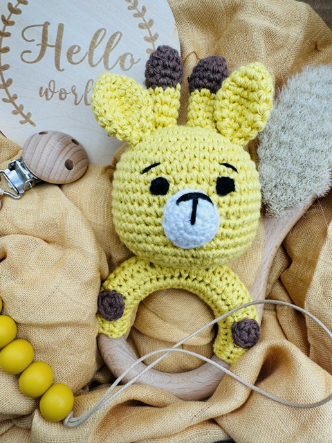 Häkelrassel aus Baumwolle und Buchenholz – handgefertigt, sicher und perfekt für kleine Hände.